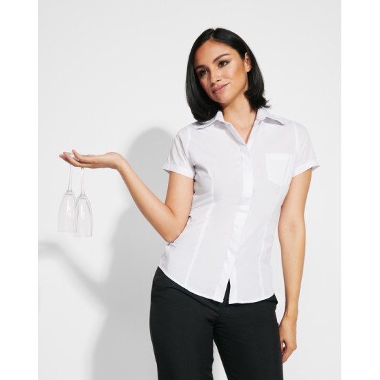 Camasa femei, cu maneca scurta, model cambrat, alba sau neagra. Combinatie de bumbac si poliester care se calca usor si se sifoneaza mai greu decat cea din bumbac 100%. Guler apretat, inchis cu 1 nasture, 1 buzunar pe piept.