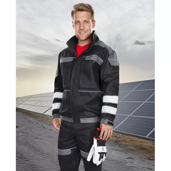 Jacheta de lucru din 100% bumbac, 260g/m2, cu dungi reflectorizante, fermoar acoperit, buzunare multiple, mansete reglabile.
