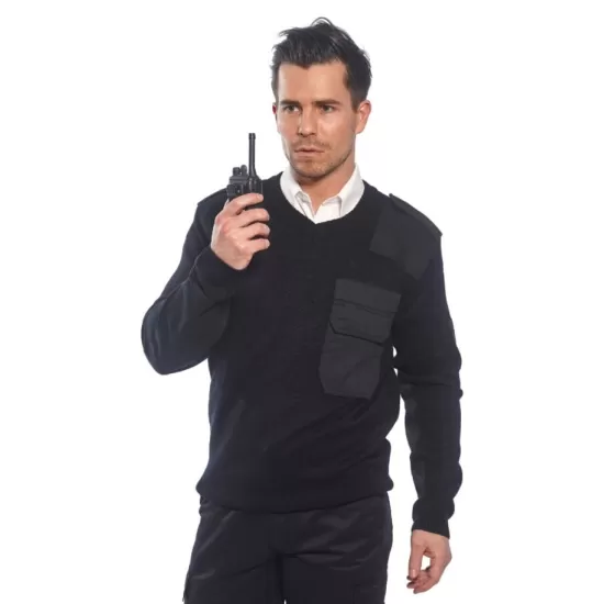 Pulover 100% acrylic, cu umerii si coatele din poliester si bumbac, arici de fixare pe umar si un buzunar pentru pix in partea din fata. Recomandat pentru personalul de paza si security, politie.