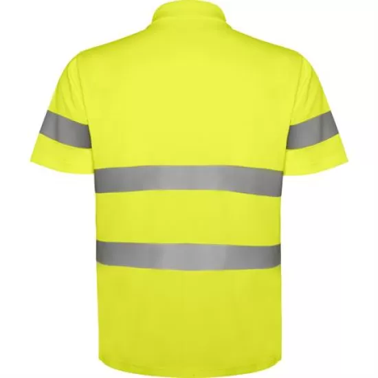 Tricou polo cu benzi reflectorizante, portocaliu sau galben fluorescent, inchidere cu 3 nasturi si guler pique. Fabricat din 100% poliester pentru a mentine racoarea si a absorbi transpiratia. Standard de protectie ISO 20471:2013.